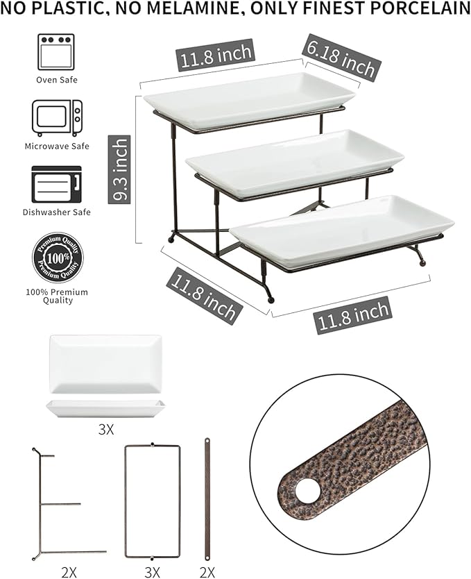 - Premium: Serving platters and trays is made of porcelain and crafted from high-quality glazed, making cleanup quick and convenient. It has a smooth surface and you can safely use it in dishwasher, microwave, oven and refrigerator. Comes with 2 cross bars. The legs and angles of the 3 tier serving stand can be fixed to make it more stability. These plates have 2 functions, they can be used individually or placed in the metal rack