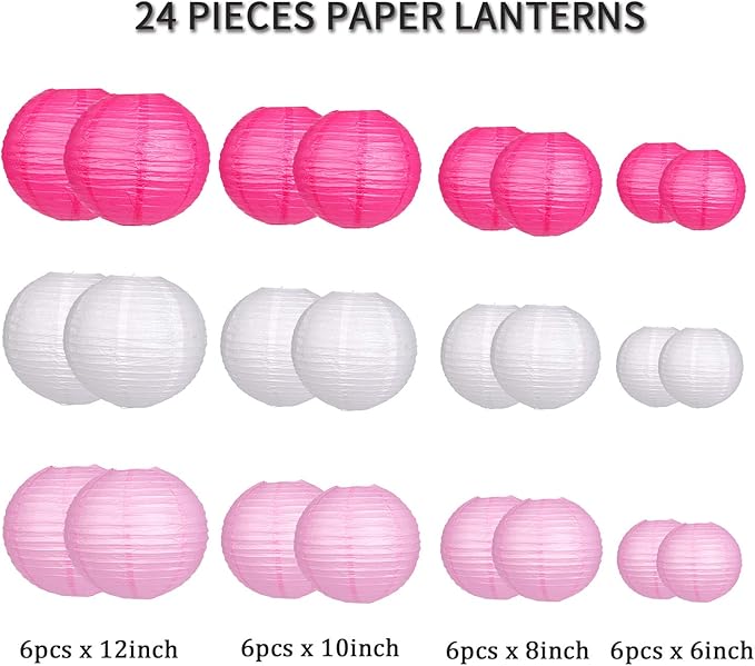 - PAPER LANTERN SETS CONTENTS- Pink white paper lantern sets come with 24 pcs paper lanterns to hang in your party, they size include 12 inch 6 pcs, 10 inch 6 pcs, 8 inch 6 pcs and 6 inch 6 pcs. These different sizes and pink paper lanterns will give you a variety of backdrops for a wide range of themed weddings and parties.