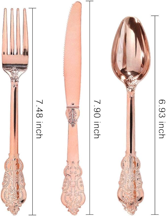- BEAUTIFUL DESIGN: Our plastic cutlery set includes 100 forks, 100 spoons and 100 knives – Lustrous rose gold cutlery gives you an elegant look that sets you all from business meetings to birthday parties including all your formal and informal events.