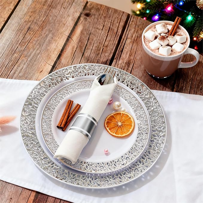 - UNIQUE DESIGN:Unique design: Disposable silver dinnerware have Perfect appearance, unique hollow lace design will make your party more elegant, by many people's strong love. Please be careful when you use them to put liquid food because maybe the food will leak out from the lace