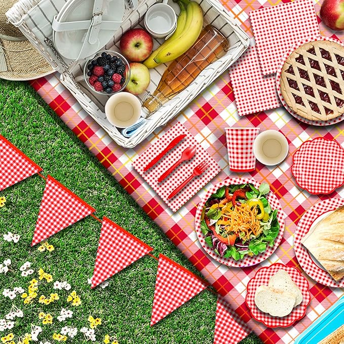 Gatherfun Gingham Red and White Party Supplies Disposable Paper Plates Napkins Cups Knives Spoons Forks Tablecloth Banner for Birthday Party Family Dinner Picnic Barbecue Mother's Day Party, Serve 25