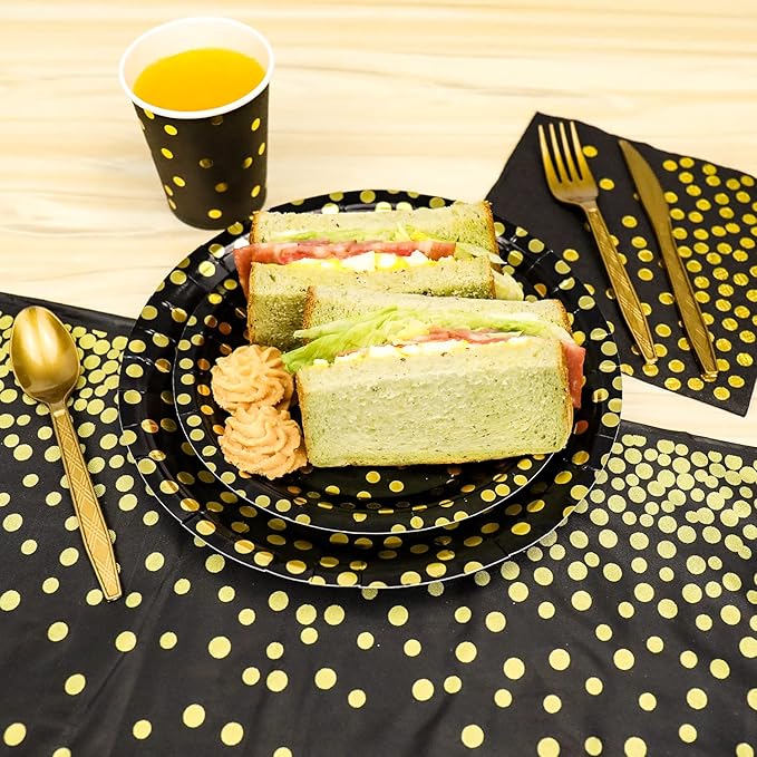 - CRAFTED WITH PREMIUM-QUALITY MATERIAL:our plates and cups boast a PET Food Grade Protective Film in Gold, exuding opulence and adding a touch of glamour to any occasion. The coordinating black napkins featuring intricate gold dots effortlessly complement the dazzling tableware, creating a cohesive and chic ambiance.