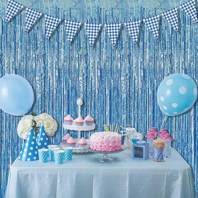 - The foil tinsel curtains are good for adding sparkle atmosphere as decorations for parties, like Boy or Girl Birthdays party, Christmas Party, Mermaid Party, Frozen Party, Winter Theme Party, Denim Party, Oneder the Sea Party, Baby Party, Shark Party, Blue Homecoming Party, Kids Party, Bachelorette Party, Engagement Party, Bridal Shower Party, Dance Party, Prom, Cocktail Party Decoration.