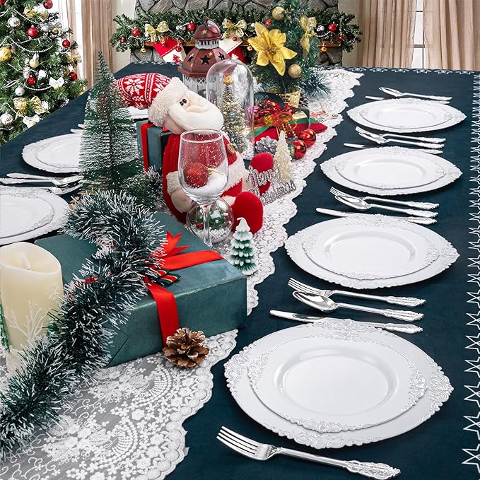Liacere 150PCS Silver Plastic Plates with Silver Cutlery - Disposable Plastic Plates Include 30Dinner Plate, 30Dessert Plate, 30Knives, 30Spoons, 30Forks - Ideal for Wedding&Christmas