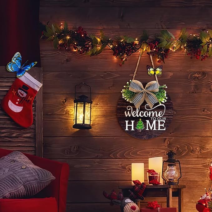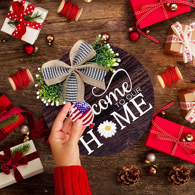 - Upgraded Design: The classic plaid bow together with the greenery of our welcome sign are firmly stapled on the rustic round wood which prevent wreath from easily falling off by wind,Upgraded with 3D engraving "HOME" design makes this welcome interchangeable sign unique and pretty, Replaced the “O” poisition magnetic with velcro tape to avoids rusting for years to come