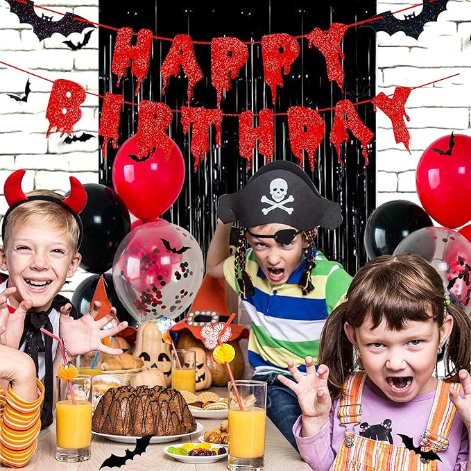 - Unique Halloween Decor: This Halloween birthday decor set with 3D bat sticker, happy birthday Halloween Banner and foil curtains, red and black latex confetti balloons, take them for your party backdrop, would give you a unique scary Halloween birthday party decorations