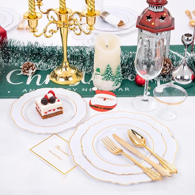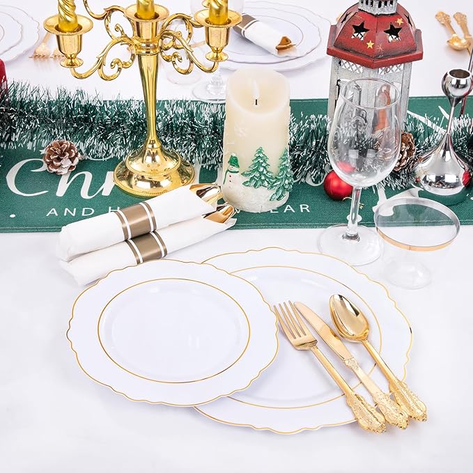 - SAFE AND HEALTHY MATERIAL - Our white and gold plates are made of 100 % food-grade, non-toxic, high-quality plastic. You can feel free to use these gold plates and use them to serve any food you want, cold or hot, it's all possible!This plastic plate is suitable for use in any scenario, Thanksgiving is also available!