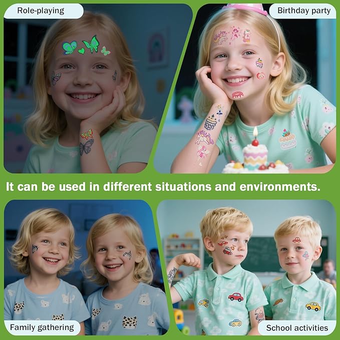 - All temporary tattoos can be used in different situations - suitable for every child, holiday party, birthday party, role play, family gathering, school activities, charity activities, sports games, everyday wear, masquerade ball, concert, beach