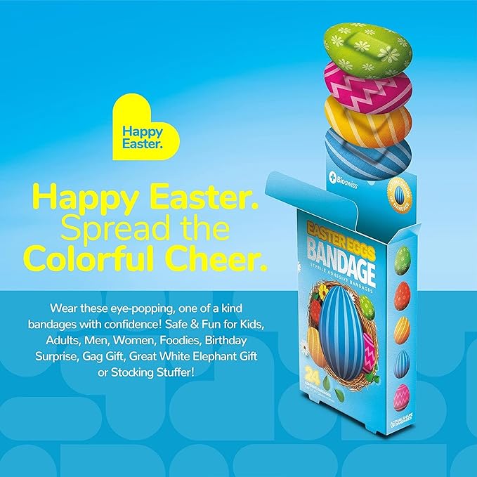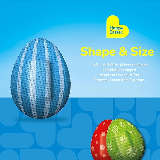 - 24 EASTER EGG KIDS BANDAGES: Fun Easter egg-shaped adhesive bandages pack helps protect cuts, scrapes, and minor wounds while making healing less stressful for children; bandages come in 5 assorted styles