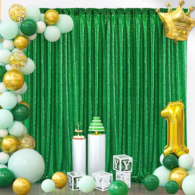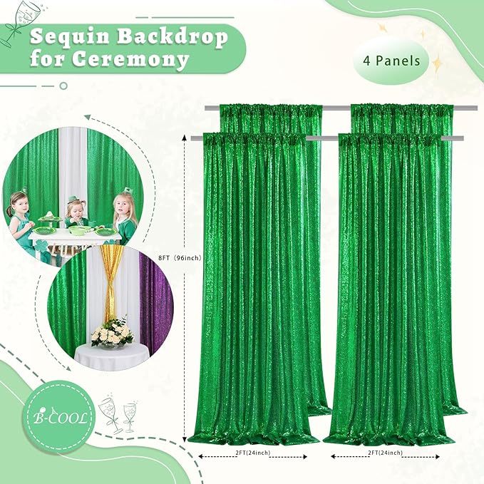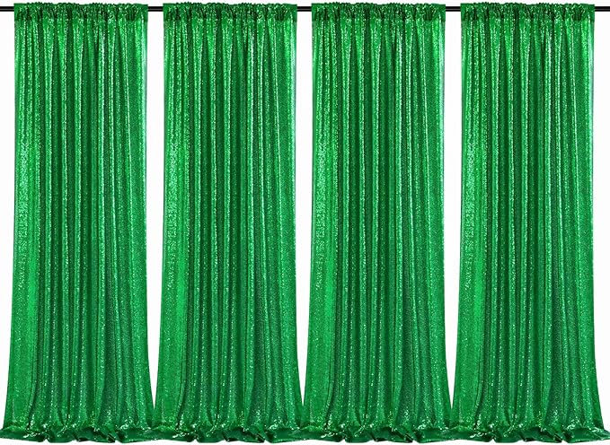 - Glitter Green Curtains: 4 Pieces 2x8ft green backdrop curtains. Suitable for Holiday Graduation Family Photography Engagement Birthday Party background decoration.