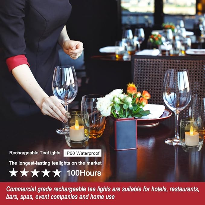 - Rechargeable Candles: These LED tea lights candles are Rechargeable and Eliminate the hassle of changing batteries or constantly buying replacement, which can continuously work for 60H after 3.5 hours quick charging, No Extra Battery Needed and saves a lot