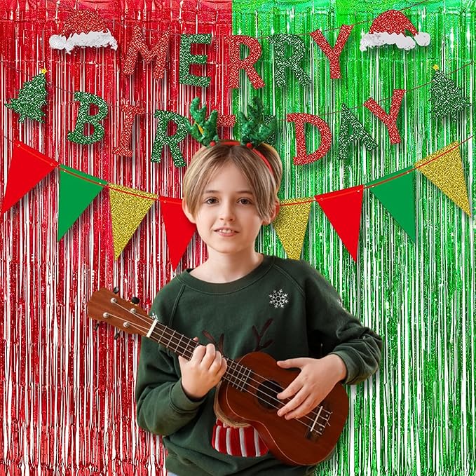 BRAVESHINE Tinsel Foil Fringe Curtains - 2 Pack 3.2 x 8.2 ft Metallic Photo Booth Streamer Backdrops for Birthdays Fiestas Melons Hawaiian Luau Tropical-Theme Christmas Party Decorations - Red Green