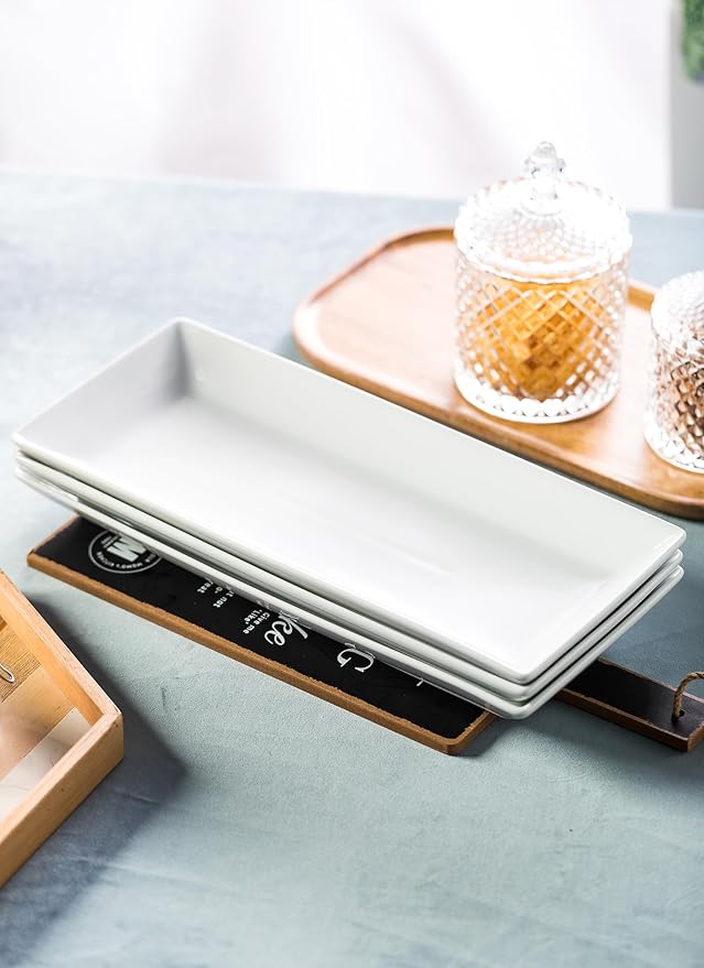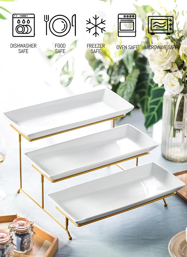 - This 3 tier serving platter set combines great quality and exquisite design. Each platter measures approximately 14" x 6". Our 3 large rectangular tiered serving tray are made of premium white porcelain, Safe for oven, microwave & dishwasher. The metal rack is hand wash only.