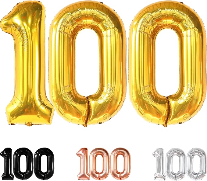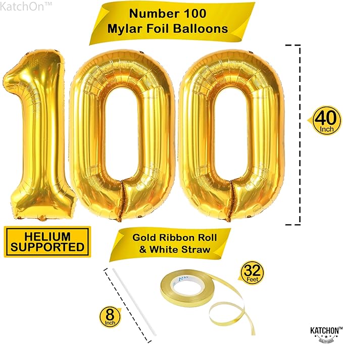 - GIANT SIZE : 40 INCH | LUXURIOUS SHINY METALLIC GOLD 100 BALLOON : Celebrating your 100 year old birthday decorations or anniversary? This giant gold Number 100 Balloon, 100 foil balloon 100 party decorations is size of 40 Inch ideal for 100 year old birthday balloons decorations. It comes with 8 inch straw and 32 foot ribbon roll. Perfect for son or daughter's 100th day of school balloons, 100th birthday decorations for women. This 100 ballon, 100 day balloon for 100th party, 100 days balloon, 100k balloons for social media.