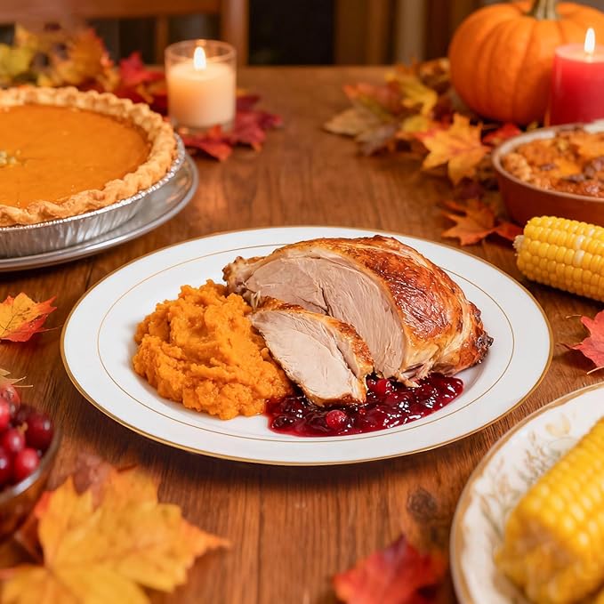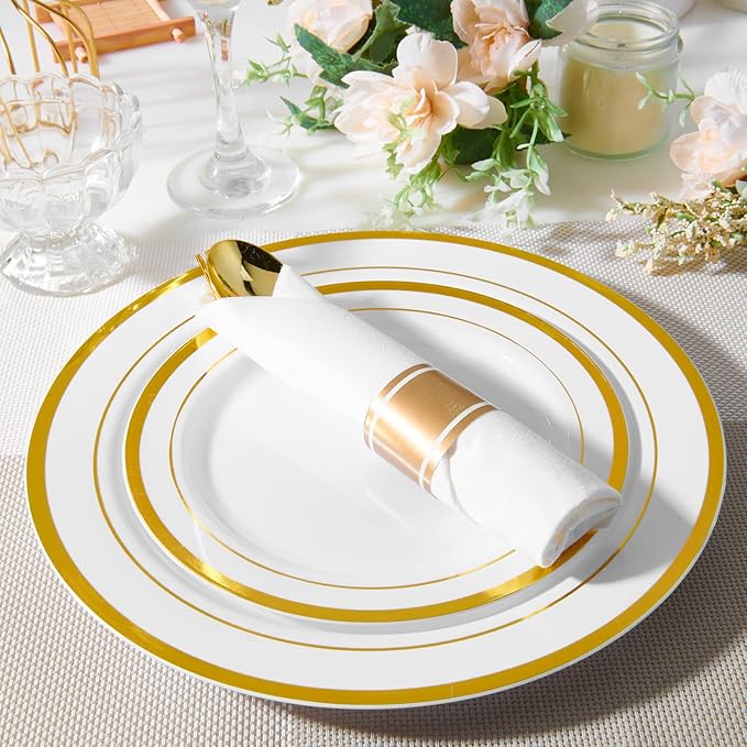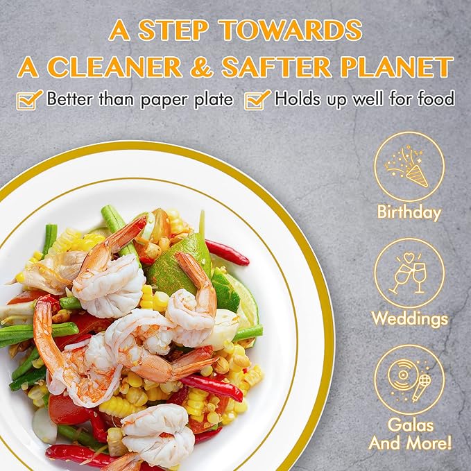 - Elegant Convenience: Save yourself the trouble with this upscale plastic dinnerware. These gold plastic plates will make any event fabulous. They are sturdy enough to serve your treats, just toss the plates when you’re done, no cleanup necessary