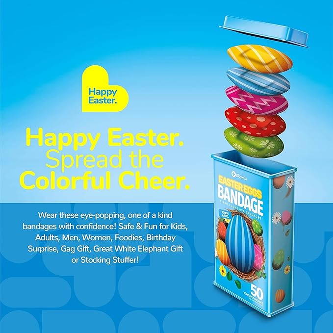 - 50 EASTER EGG KIDS BANDAGES: Fun Easter egg-shaped adhesive bandages tin helps protect cuts, scrapes, and minor wounds while making healing less stressful for children; bandages come in 5 assorted styles