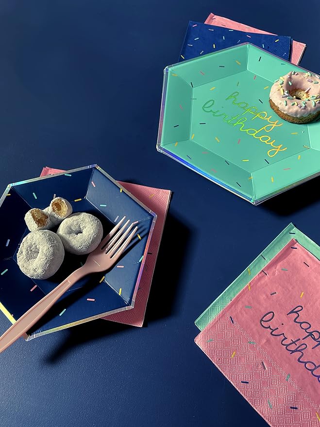 Harlow & Grey Sprinkles Party Plates and Napkins Set, 60-pc Bright Happy Birthday Kit, Multi- Color Pack w/ Pink, Teal, Navy Blue Disposable Paper Dinnerware Supplies for Kids, Adult Parties