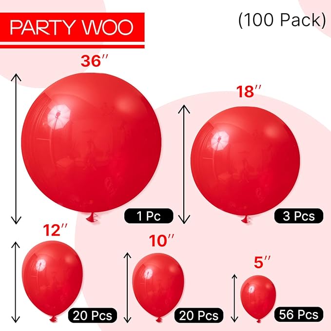 PartyWoo Red Balloons, 100 pcs Matte Balloons Different Sizes Pack of 36 Inch 18 Inch 12 Inch 10 Inch 5 Inch Latex Balloons for Balloon Garland or Balloon Arch as Party Decorations, Red-Y57