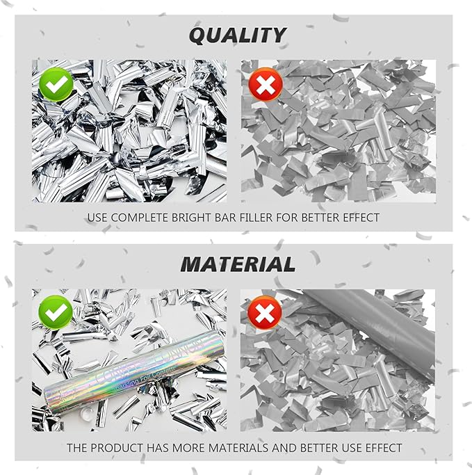 - SAFE & EASY TO USE: Our silver confetti cannon kit is non-toxic, and made with foil confetti papers. Foil party poppers confetti shooters work well indoors and outdoors easy to clean and 100% safety, you and your guests can enjoy confetti cannon for your celebrations launch your celebration unforgettable memories!