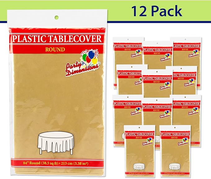Party Dimensions Gold Disposable Plastic Tablecloth for Round Tables (12 Pack) 84 inches Table Cloths for Parties, Events & Weddings, Indoors & Outdoors, Plastic Table Cover