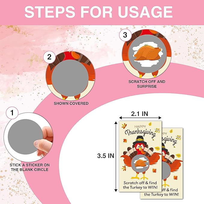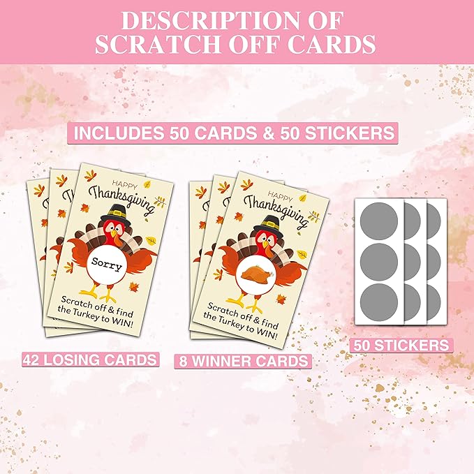 - SUPERIOR DESIGN: You can entertain everyone at the Thanksgiving's Day Party with this game cards. This cute design style scratcher cards are always a big hit with any crowd. The pumpkin and turkey designs perfectly match your party.