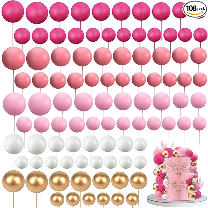 108 Pcs Balls Cake Topper DIY Cupcake Insert Foam Balloons for Cake Baking Wedding Anniversary Birthday Decoration(Pink Series, White, Gold,Multi Sizes)