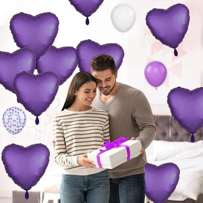 - 10 PCS PURPLE FOIL HEART BALLOONS: Package contains 10 x 18 inch Purple heart balloons, 1 x 10m ribbon.The Purple heart shape balloons are specially shaped, the perfect size for your holiday or party decorating needs, together create a fun and surprising party, leave an unforgettable smile!