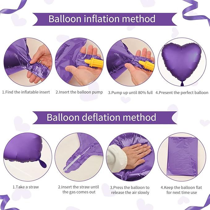 - EASY TO USE: These Purple heart birthday balloons can be filled with air and helium (Inflate to 85%-90%, in case it is too large and explodes).The valve seals automatically when inflated, the gas inside can be emptied with a plastic straw, which can be reused later.Purple valentines balloons set have 10 meters ribbon, you can decorate your room with balloons for your children and spouse.