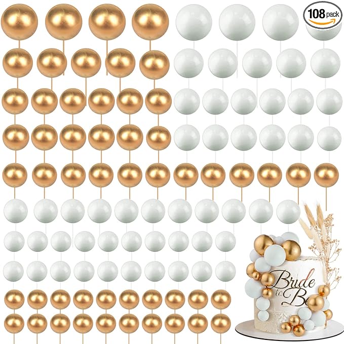 108 Pcs Balls Cake Topper DIY Cupcake Insert Foam Balloons for Cake Baking Wedding Anniversary Birthday Decoration(White, Gold,Multi Sizes)