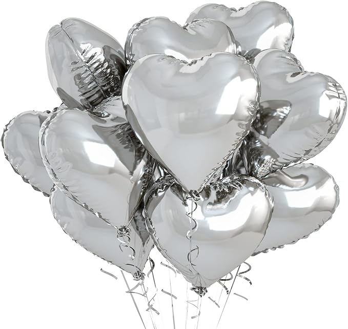 - π 10 PCS Silver Heart Balloons: Our package contains 10 x 18 inches silver heart shaped balloons, 1 x 10m ribbon. The silver foil heart balloons are specially designed to add a touch of fun and surprise to any party or holiday celebration. With a size of 18 inches, they are the perfect addition to your decorating needs, leaving your guests with an unforgettable smile!