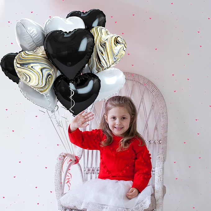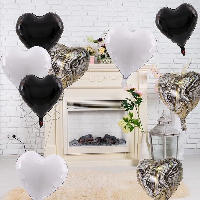 - π 10 PCS Black White Heart Balloons: Our package contains 4 x 18 inch black heart balloons, 4 x 18 inch white heart balloons, 2 x 18 inch black agate heart balloons, 1 x 10m ribbon. The foil heart balloons are specially designed to add a touch of fun and surprise to any party or holiday celebration. With a size of 18 inches, they are the perfect addition to your decorating needs, leaving your guests with an unforgettable smile!