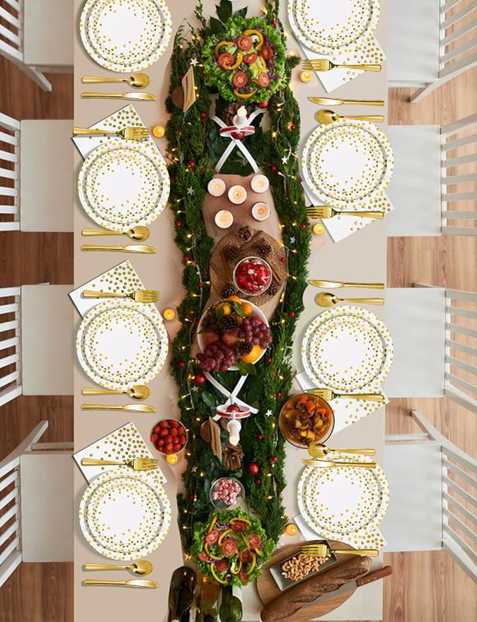 - 🍰【High Quality and Elegant Design】Our party supplies pack features a White background and gold foil polka dot pattern, adding a touch of sophistication to your event. Made of 100% food-grade paper, our plates are sturdy and can hold heavy foods without bending or breaking. All party dinnerware are made of BPA-free, non-toxic, and tasteless plastic that is very strong and won't bend or break.