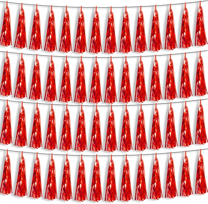 4P Red Foil Fringe Metallic Tassel Streamers Banner Tassel Garland for Parade Floats, Bachelorette, Wedding, Birthday, Halloween, Christmas, Bridal/Baby Shower Party Decorations