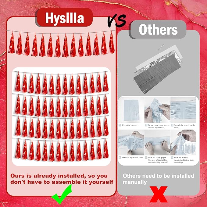 - 【Red Party Supplies Set】: The total length of the red birthday tassels banner is 26.2 feet, divided into 4 strips, each 6.5 feet long. Each banner contains 15 tassels, and each tassel measures 14 inches, for birthday decorations many occasions, and so on