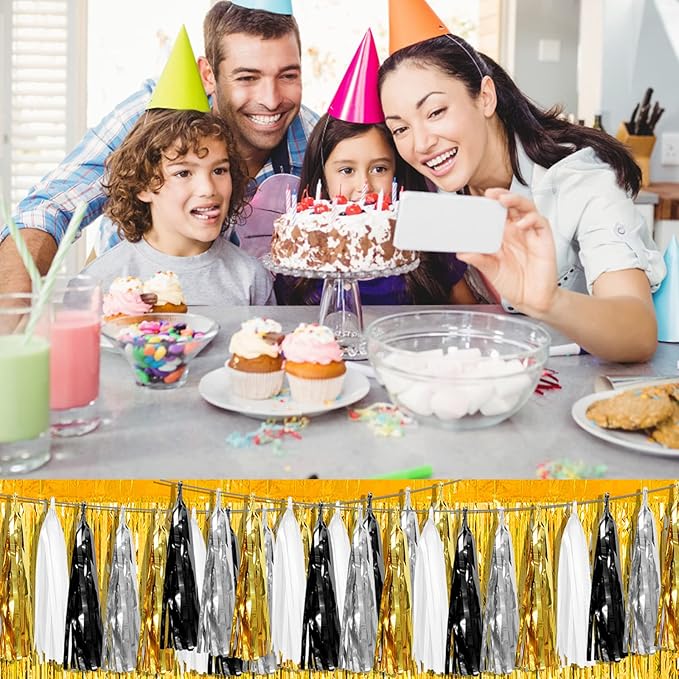 - 【Black Silver Gold White Party Supplies Set】: The total length of the Black Silver Gold White birthday tassels banner is 26.2 feet, divided into 4 strips, each 6.5 feet long. Each banner contains 15 tassels, and each tassel measures 14 inches, for birthday decorations many occasions, and so on