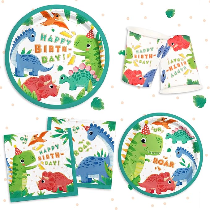 Dinosaur Birthday Party Supplies Disposable Paper Plates Napkins Cups Tablecloth and Banner for Dinosaur Party Decorations Serve 25