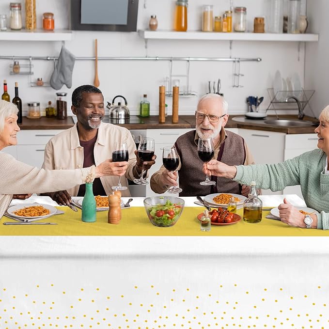 - What you will get: the package includes 6 pcs white and gold confetti dot plastic tablecloth and 6 pcs gold satin table runner, specific color as the picture shown, nice combination for you to use in daily life or important occasions enhancing the atmosphere for your event.