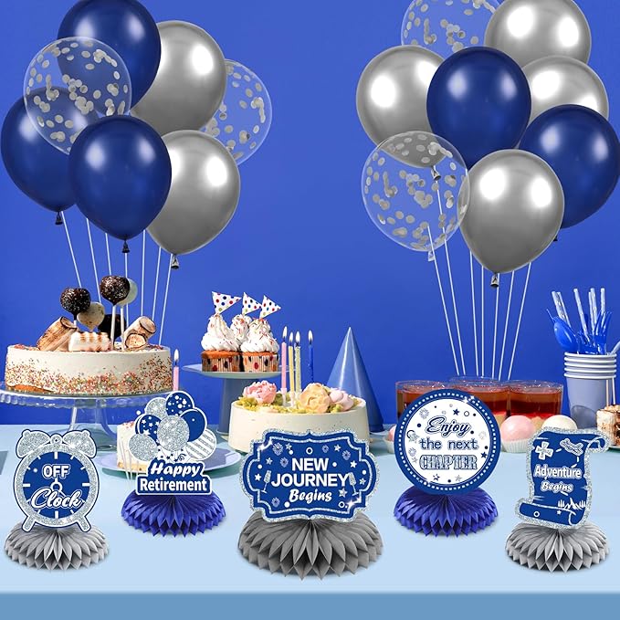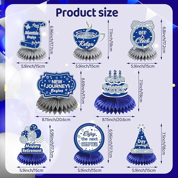 - What You Will Get: This package include 8 pieces of navy blue silver retirement theme honeycomb centerpieces in 8 different designs, combine blue silver with retirement elements, suitable for men and women, accompany you and your family and friends to spend an unforgettable and warm retirement party.