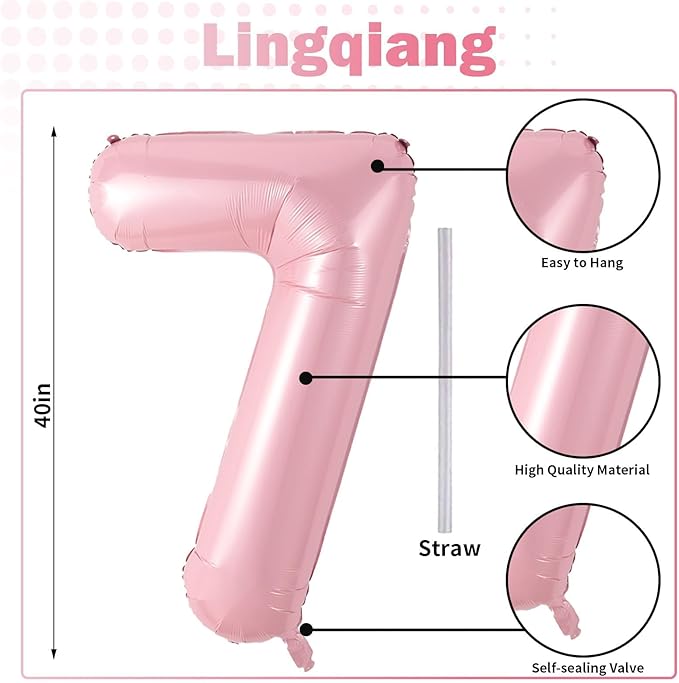 - π Pastel Pink Number 7 Balloon π - You will get 1pc 40 inch mylar foil number 7 balloon and 1pc straw. Perfect for 7th 17th 27th 70th 75th birthday or anniversary party decorations supplies.