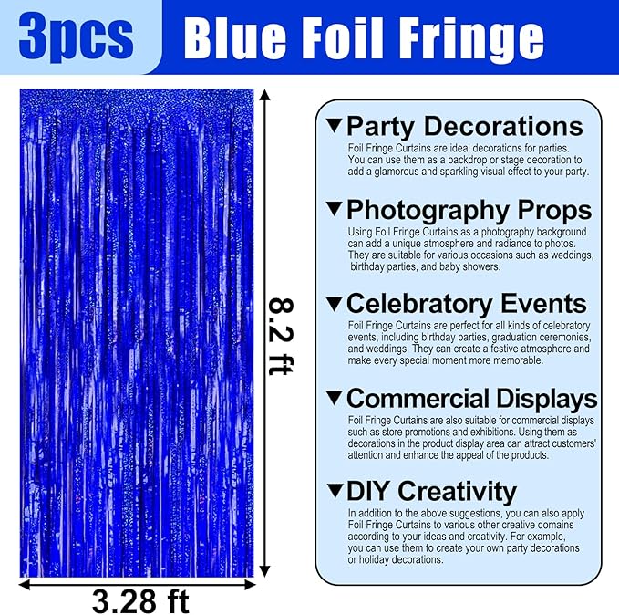 - 3.28Ft x 8.2Ft Feet | Vibrant Shiny Streamers : This sparkling tinsel blue fringe curtain is large size of 3.28ft x 8.2ft feet, pack of 3. Made of aluminium foil. This decorations for party backdrop will radiates laser like shine. and this will be a perfect party backdrop for the photo booth you had prepared for your friends and kids.