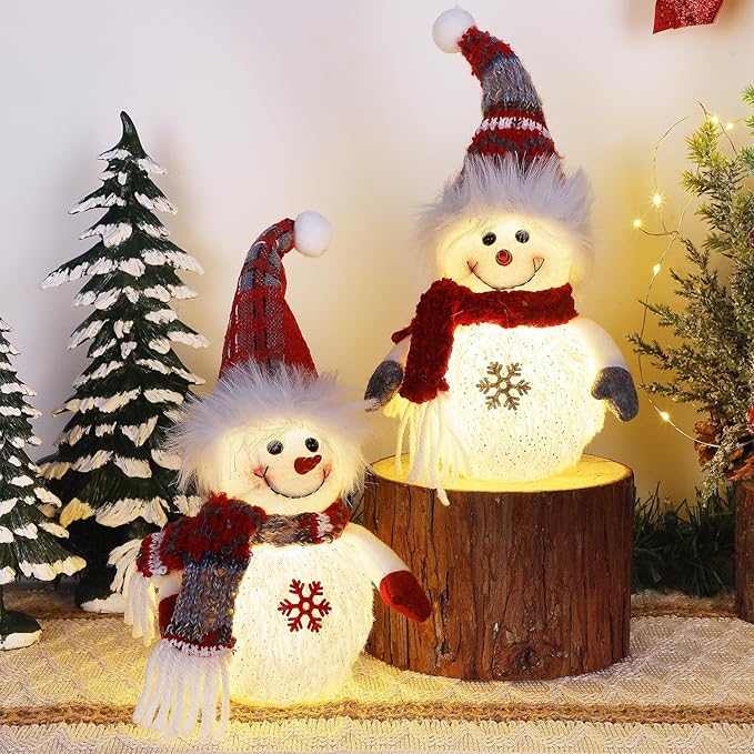 - 2 Pack Lighted Christmas Snowmen: These adorable lighted Xmas decorative plush snowmen wearing pointy buffalo plaid hats with fluffy white brim and a white ball on the top, perfect tabletop decorations that are indispensable in your home. They are popular motif around holidays and very suitable for spreading the traditional spirit