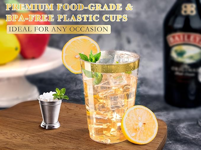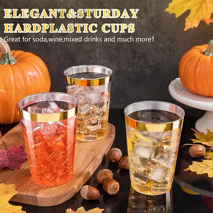 - Perfect for any occasion: Our gold rim plastic cups for party have a 12 oz capacity and are suitable for most occasions. Such as for weddings, receptions, birthday party, holiday party, picnics, family reunions and other events.