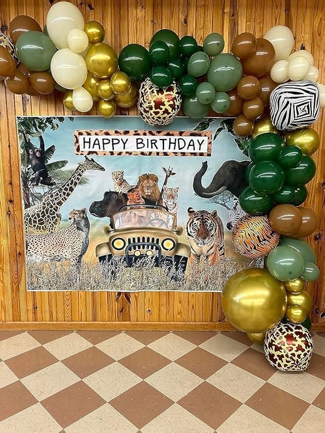 - Jungle Safari Party Supplies - You will get 60 pieces 12 inch latex party balloons set, includes dark green 20pcs, olive sage green 10pcs, retro brown coffee 10pcs, apricot 10pcs, metallic gold 10pcs, come with 1pc white balloon ribbon. A tropical Hawaiian luau for your boy or girl! Your kids will LOVE the realistic & wild jungle safari theme party decorations.