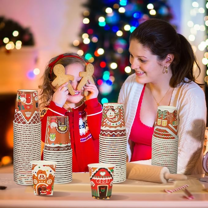 Zhehao 200 Pcs Christmas 9 oz Paper Cups Disposable Coffee Cups Santa Snowman Elk Disposable Hot Cups Xmas Party Drinkware Supplies for Holiday Tea Beverage Cocoa Cold Hot Drink (Gingerbread Style)