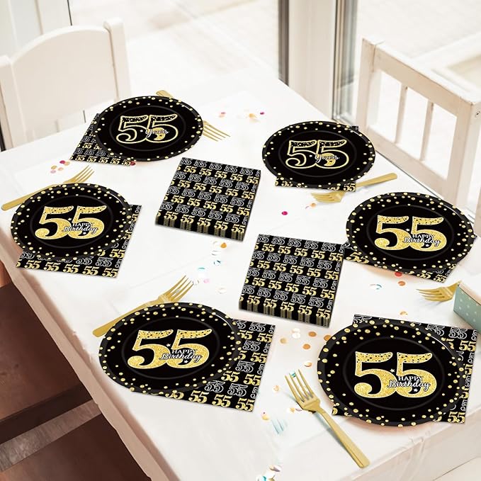 - 55th birthday design: design with black gold 55th birthday party elements, like confetti, large letters, etc, make a memorable and meaningful party with this exquisite 55th birthday party tableware.