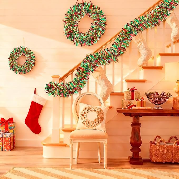 - 【Widely Application】Christmas tinsel garland perfect for Christmas and fantastic for any holiday season decoration. Ideal for party, weddings, festivals ,home decorations, gardens, bushes,floral tributes,artwork,Halloween angel costumes, Christmas trees, Christmas costume,walls,hedges, stair handrail,doorways, windows, poles, tables and more.
