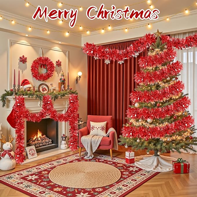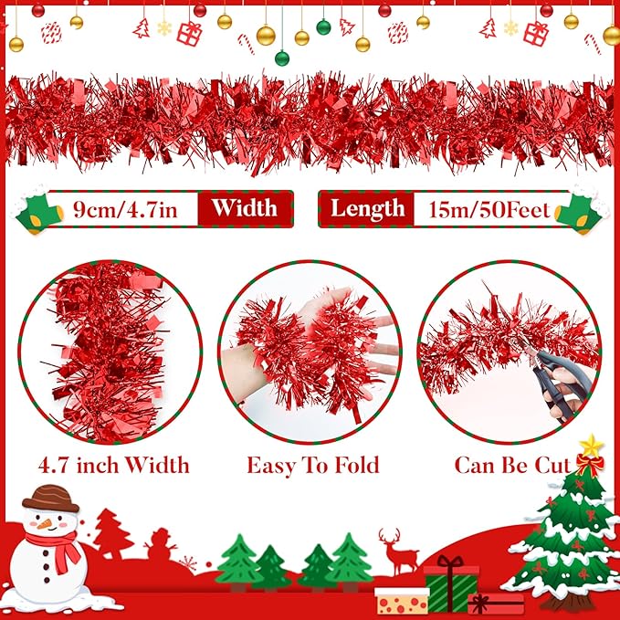 - 【Christmas Tinsel Garlands】The Christmas tinsel garland size 50 ft (L)X 3.54 inches (W),enough for your Christmas party decorations, you can combine different colors together to add a bright and Christmas atmosphere to your holiday decorations.
