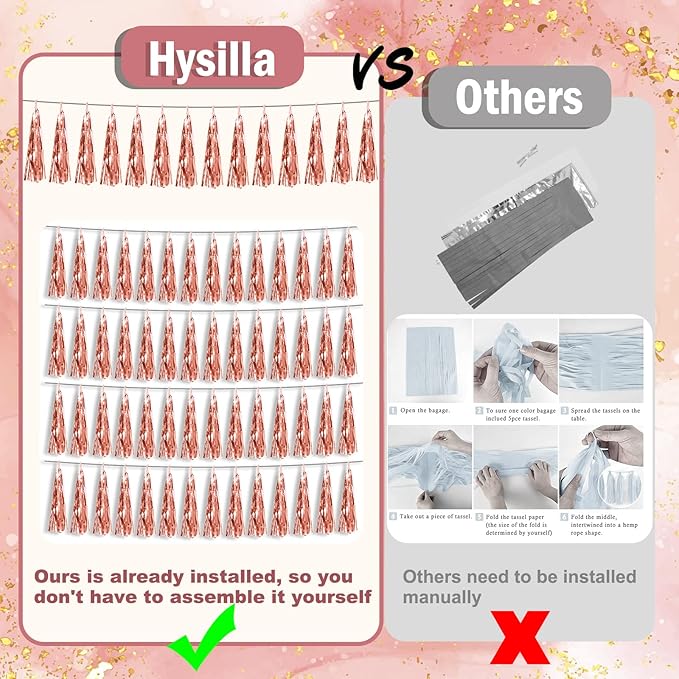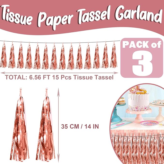 - 【Rose Gold Party Supplies Set】: The total length of the rose gold birthday tassels banner is 29.5 feet 45tassels, divided into 3 strips, each 9.8 feet long. Each banner contains 15 tassels, and each tassel measures 14 inches, for birthday decorations many occasions, and so on
