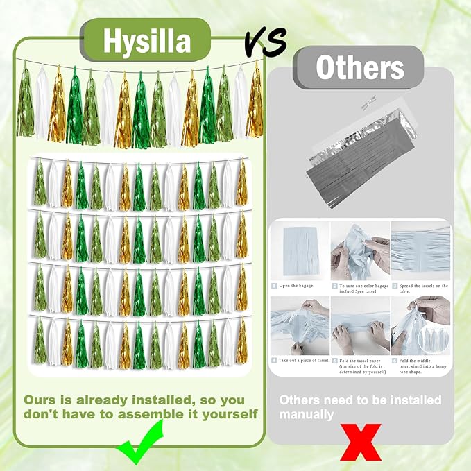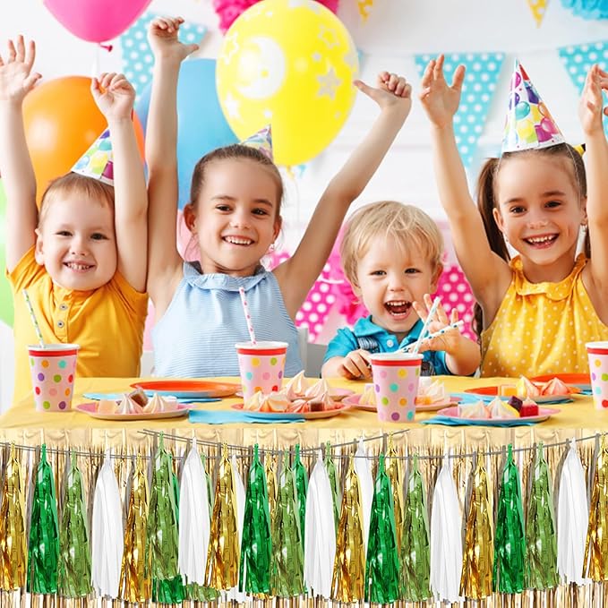 - 【Light Green White Gold Green Party Supplies Set】: The total length of the Light Green White Gold Green birthday tassels banner is 29.5 feet 45tassels, divided into 3 strips, each 9.8 feet long. Each banner contains 15 tassels, and each tassel measures 14 inches, for birthday decorations many occasions, and so on
