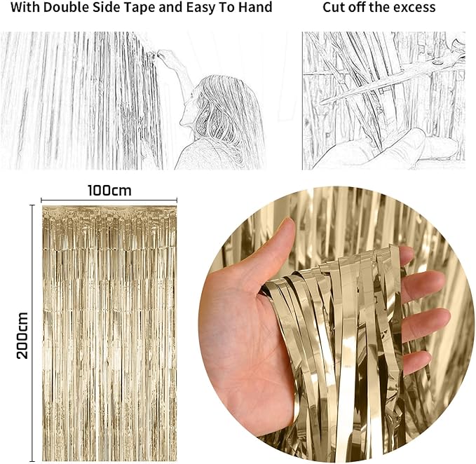 - EASY TO USE - Gold white birthday balloons can be blown up with air or helium! The foil balloons have self-sealing valve does not need to be knotted. And The happy birthday banner bunting comes with ribbon, very easy to assemble and hang. Tear off the back of adhesive tape, then paste this champagne gold fringe curtain on the top of wall, window, door or anywhere you like to light up your party.